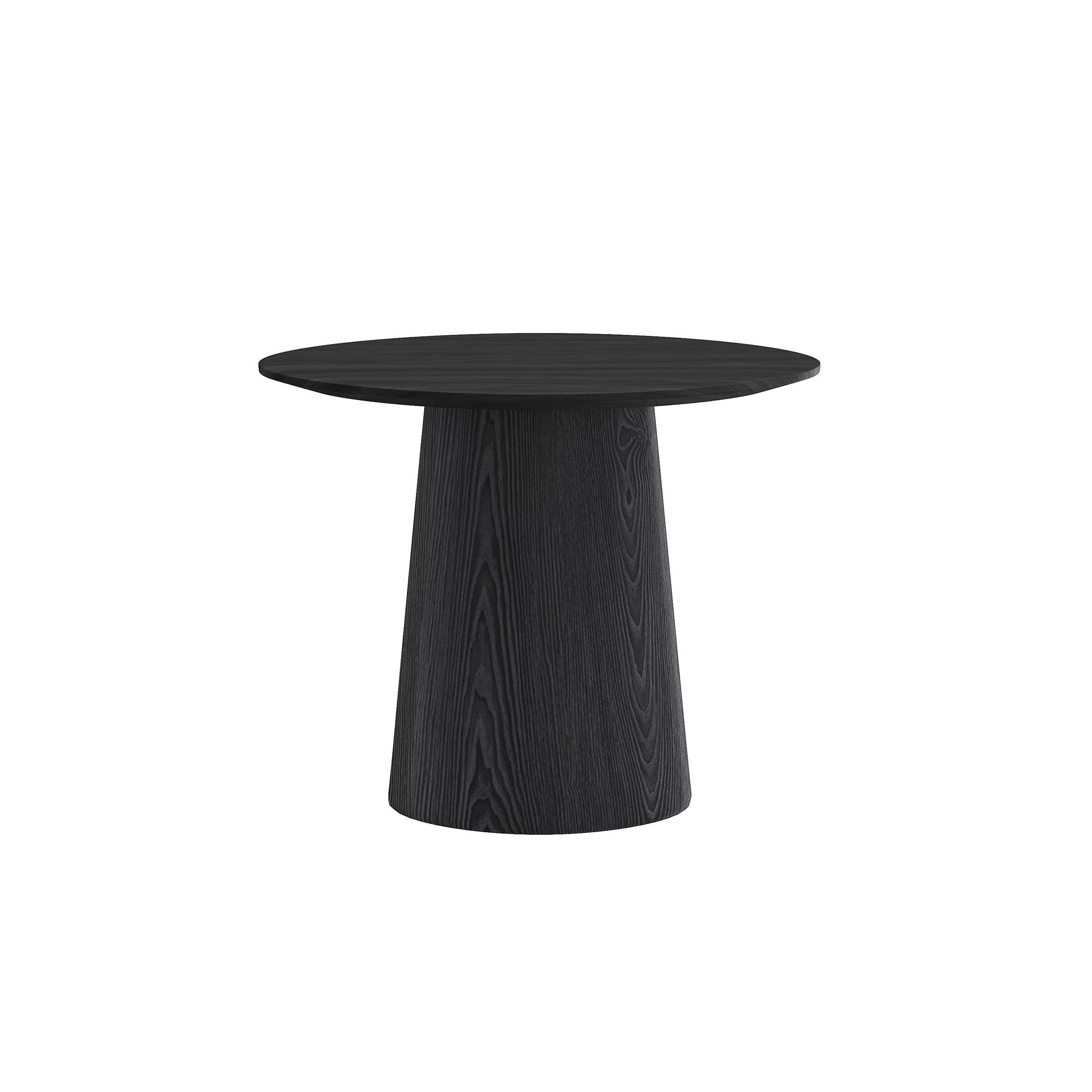 This sleek black round table is crafted with MDF veneer spraying: its smooth top pairs with a tapered, wood-grain-textured pedestal base, merging bold monochrome style and subtle tactile detail. Sturdy yet cost-effective, its cohesive design suits industrial or contemporary spaces—ideal as a compact dining or accent piece, balancing polished aesthetics with everyday practicality seamlessly.