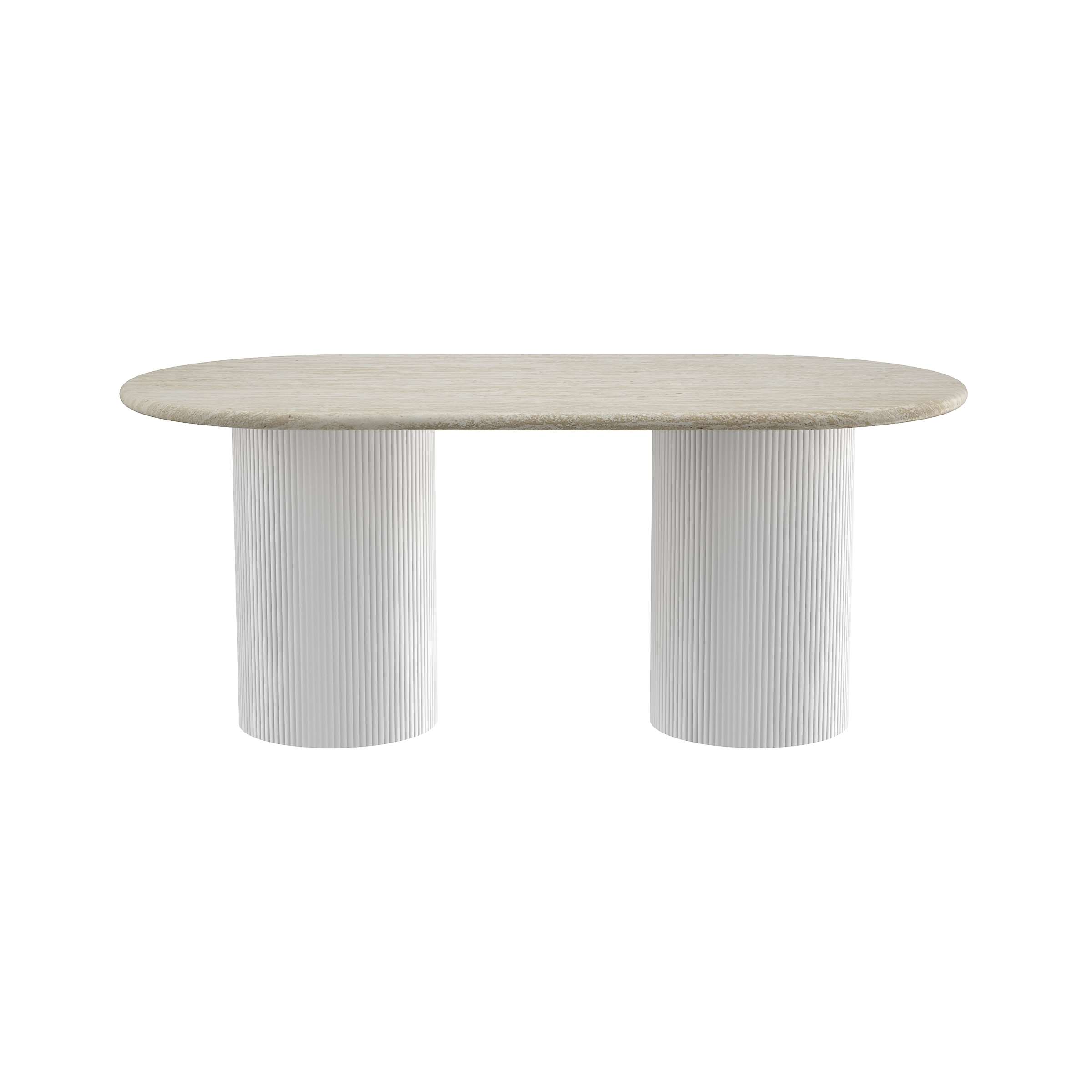 This elegant oval table blends light wood-look MDF-veneer top with white ribbed MDF-veneer legs. Its textured cylindrical supports and soft neutral tones lend a modern, airy charm—ideal for dining or living spaces.