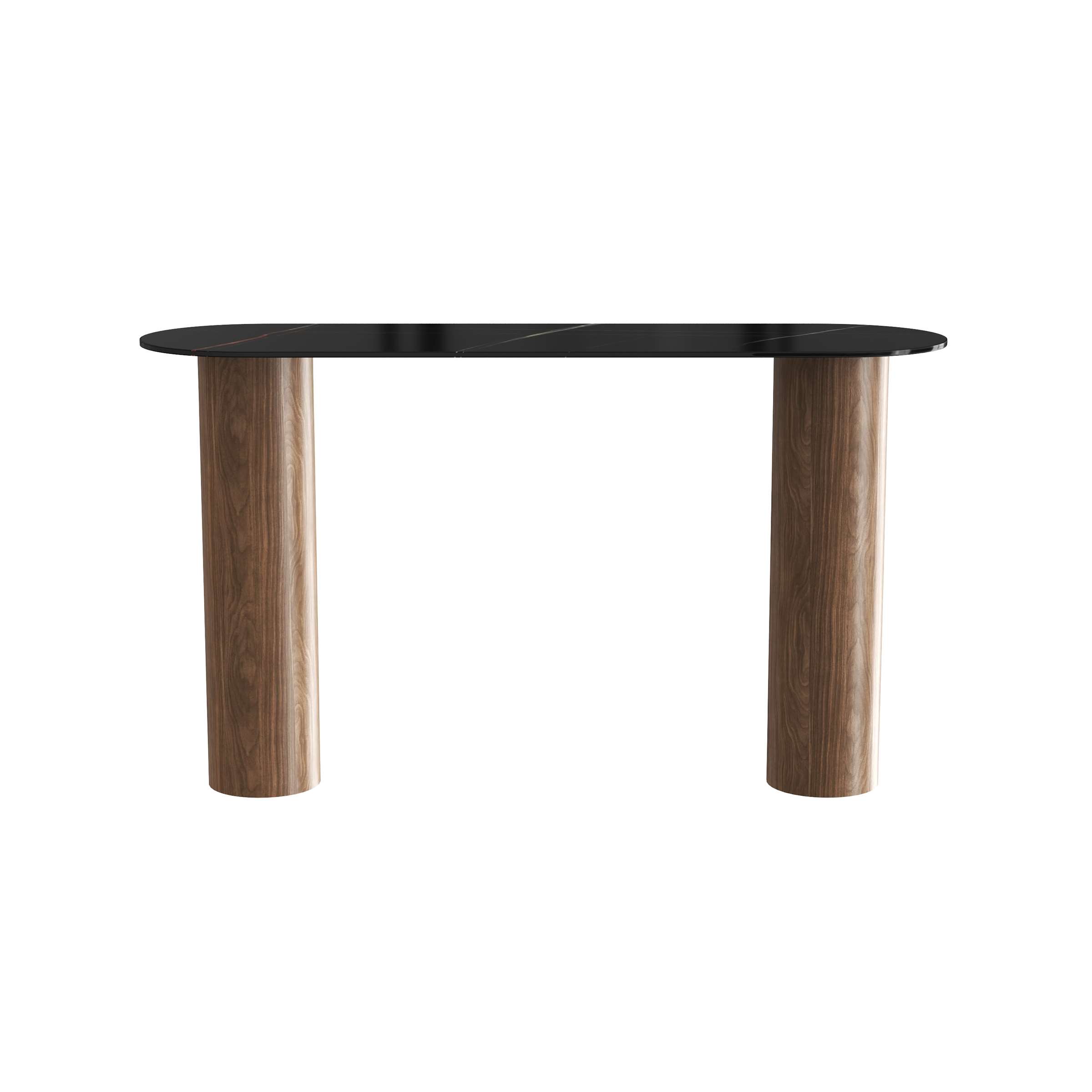 This console table pairs an 11mm sintered stone top (sleek matte black, scratch-resistant) with walnut-grain MDF veneer cylindrical legs. Its curved surface and contrasting textures blend modern boldness with warm organic charm, fitting contemporary entryways. Sturdy yet balanced, it serves as a functional drop zone while adding a refined, dual-tone focal point that softens the space’s edge with woody warmth.