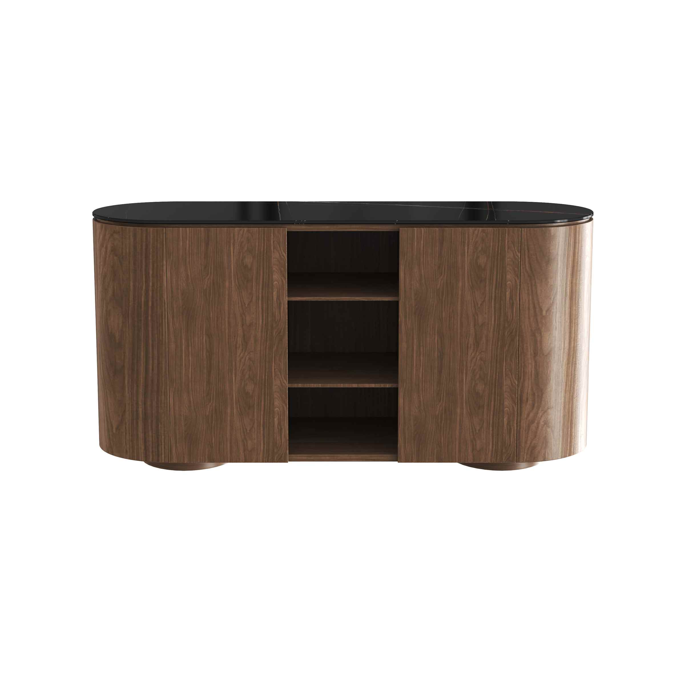 This stylish sideboard pairs a 11mm sintered stone top (durable & sleek) with MDF walnut-veneer cabinetry. Its curved silhouette, open central shelf + enclosed storage blend practicality with modern charm.
