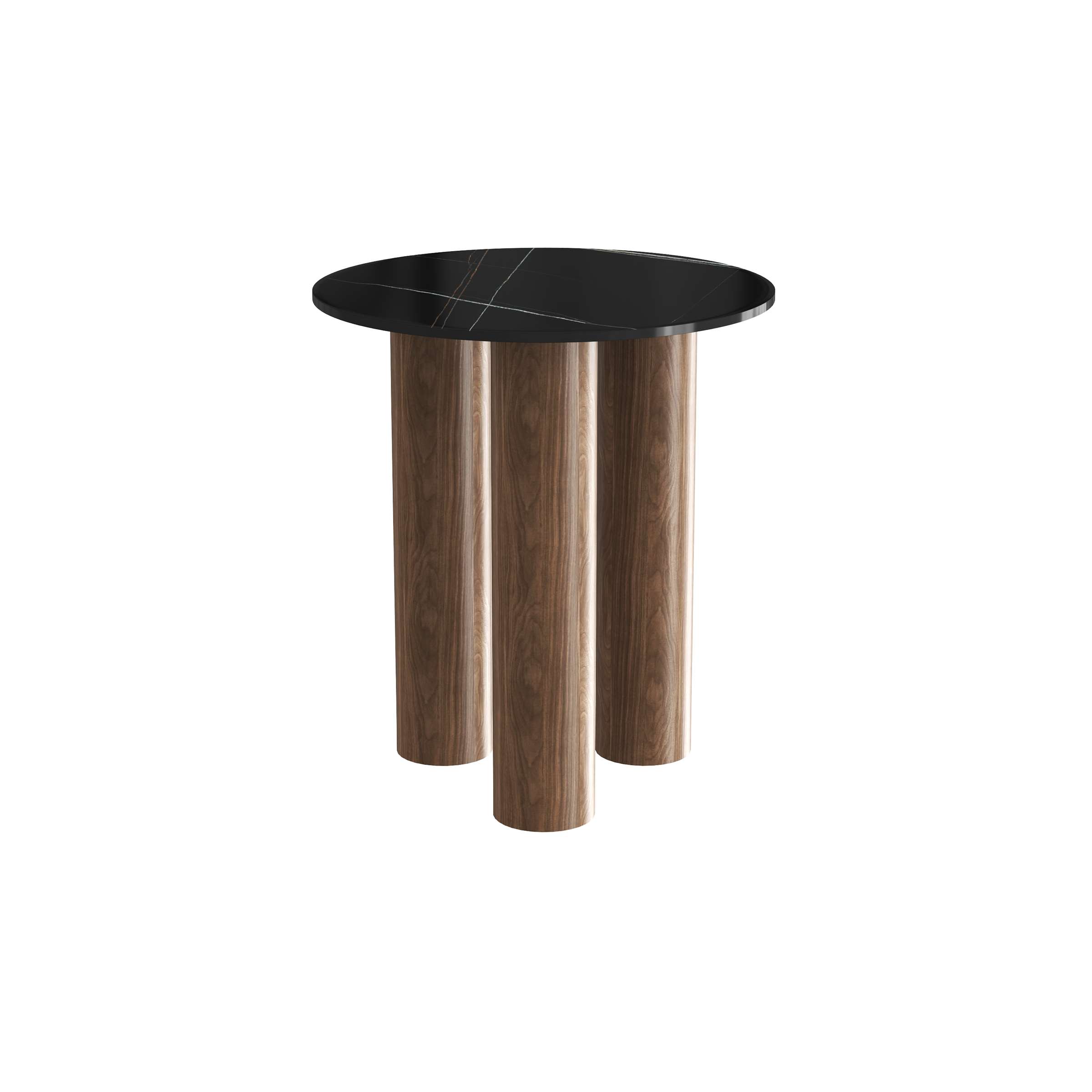 This round table pairs an 11mm sintered stone top (sleek black with fine veins, scratch/stain-resistant) with walnut-grain MDF-veneer cylindrical legs. The contrast between the luxe stone surface and warm wood-textured base blends modern elegance with approachable charm, fitting contemporary spaces. Sturdy yet budget-friendly, it’s a polished, practical pick for dining areas.