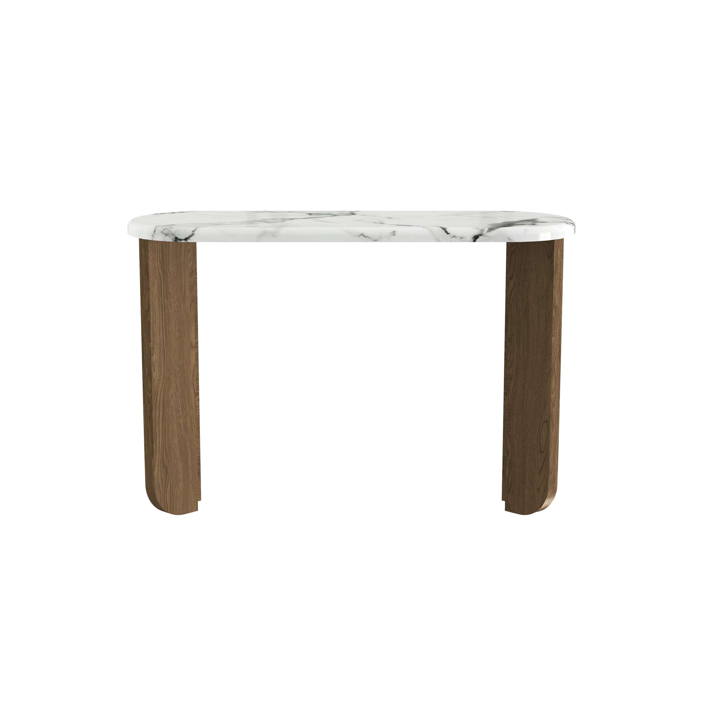 This console table pairs an 18mm marble top (veined white, luxuriously polished) with warm wood-grain MDF veneer legs. Its curved surface and gently flared supports blend classic elegance with modern softness, fitting refined entryways. Sturdy yet graceful, it merges the marble’s sleek sophistication with the MDF’s cozy texture—serving as a functional drop zone while adding a balanced, timeless charm to the space.