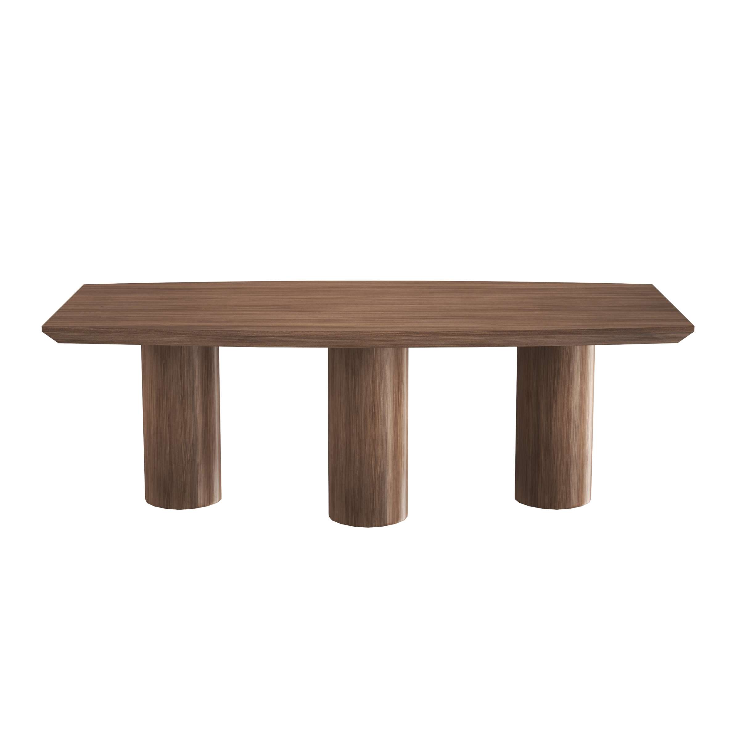 This rectangular table, finished with walnut-look MDF veneer, features a smooth top and three cylindrical legs for a cohesive, warm wood-textured design. Sturdy yet budget-friendly, its minimalist silhouette suits Nordic or contemporary spaces—ideal as a dining or workspace centerpiece, merging understated natural charm with everyday practicality seamlessly.