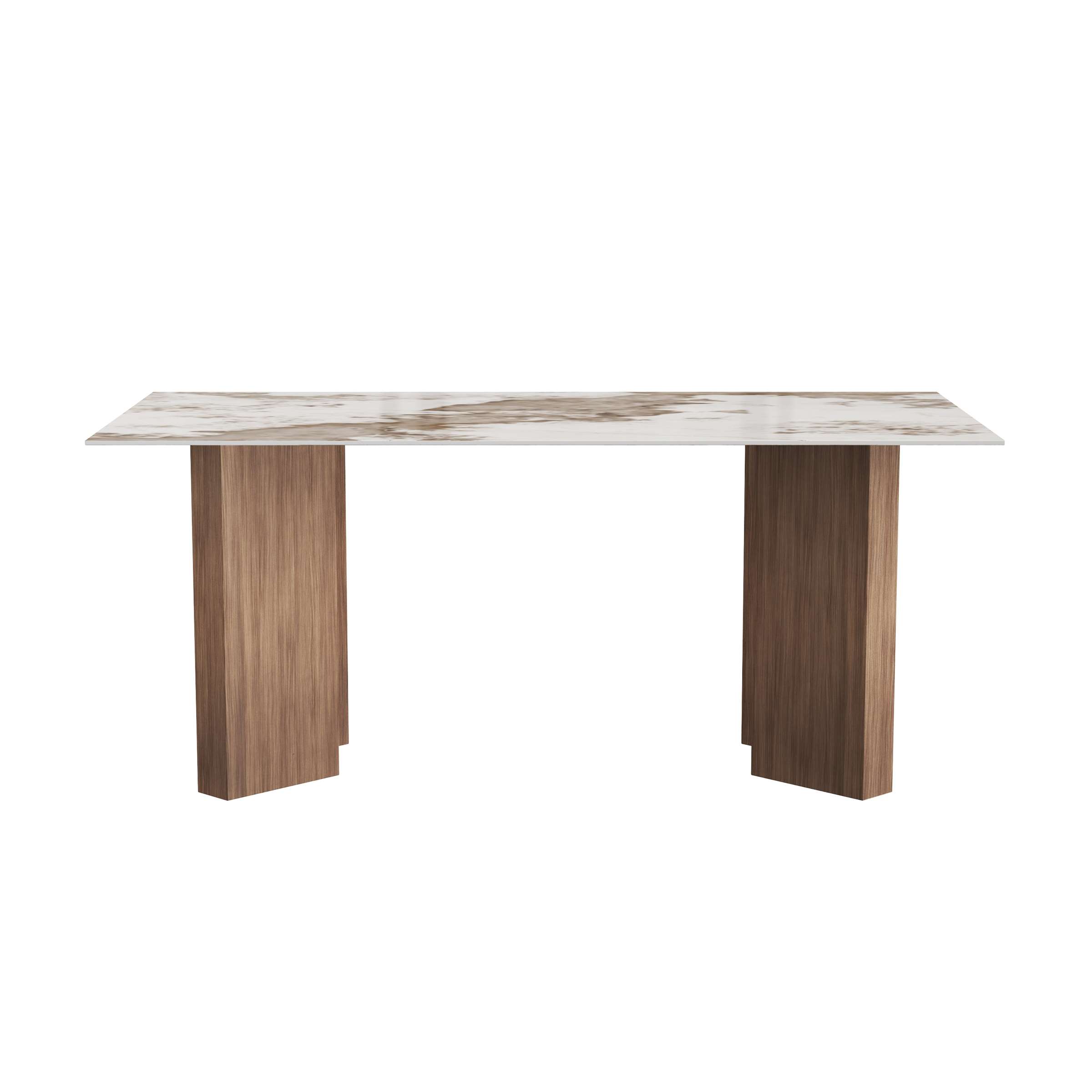 This elegant rectangular table pairs an 11mm sintered stone top (durable, stain-resistant) with walnut-look MDF-veneer legs. Its sleek stone surface (with marble-like veining) blends luxe texture with warm wood charm, fitting modern/Nordic spaces.The sturdy MDF base balances budget-friendly practicality, making it ideal for dining areas. It merges polished style with everyday functionality for a refined, versatile pick.