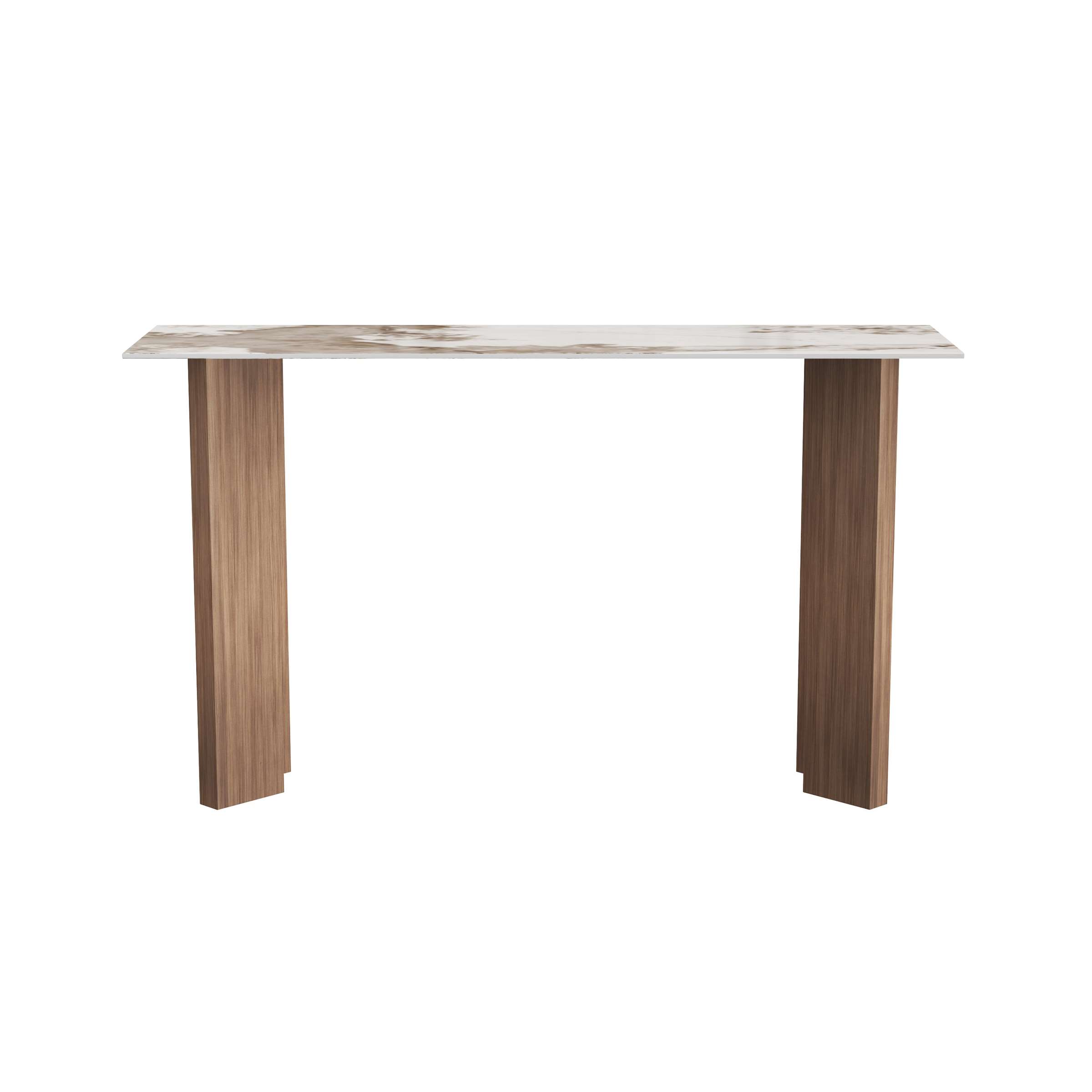 This console table pairs an 11mm sintered stone top (softly marbled in light tones, scratch-resistant) with walnut-textured MDF veneer legs. Its rectangular surface and tapered, angular supports bring a sleek, mid-century modern touch, fitting refined entryways. Sturdy yet understated, it merges the stone’s polished practicality with the wood’s warm grain—serving as a functional drop zone while infusing the space with a balanced, timeless elegance.