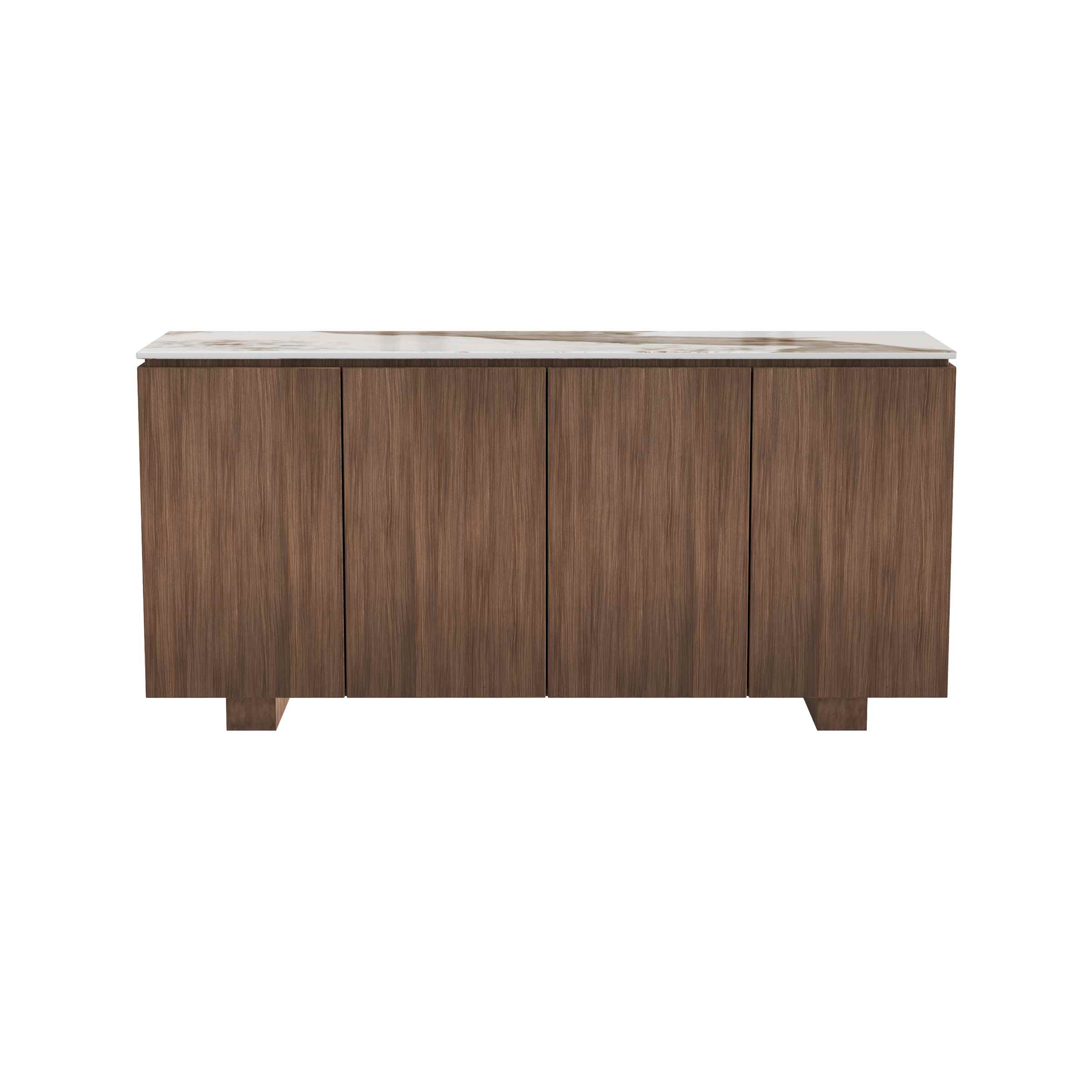 This elegant sideboard pairs a 11mm sintered stone top (durable, stain-resistant) with MDF walnut-veneer cabinetry. Its 4-door design offers ample storage, while the warm wood finish and sleek stone top blend luxe texture with budget-friendly practicality.