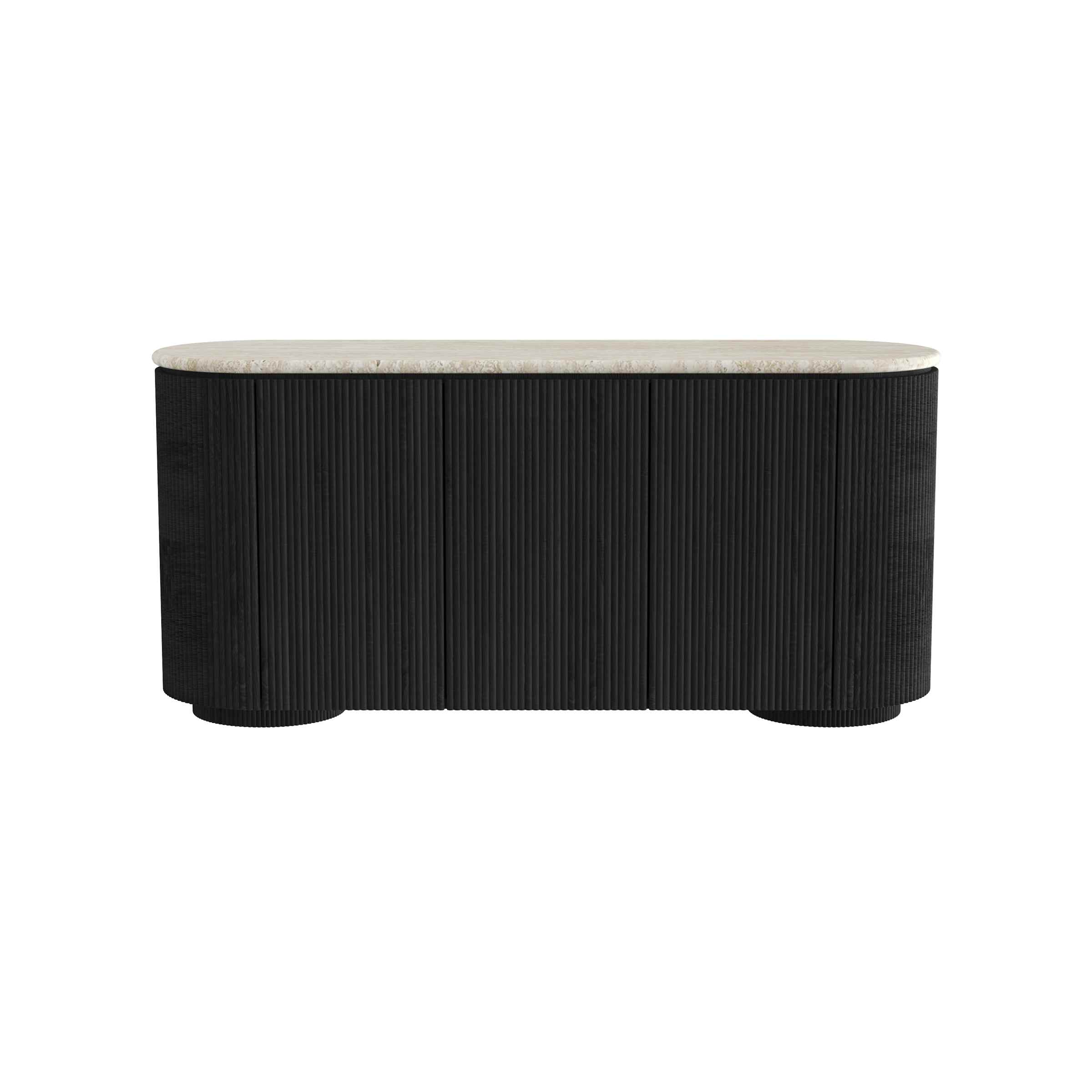 This sleek black MDF-veneer sideboard leans into modern texture: its full-body ribbed finish and curved silhouette bring tactile sophistication, while the 3-door design offers ample storage.