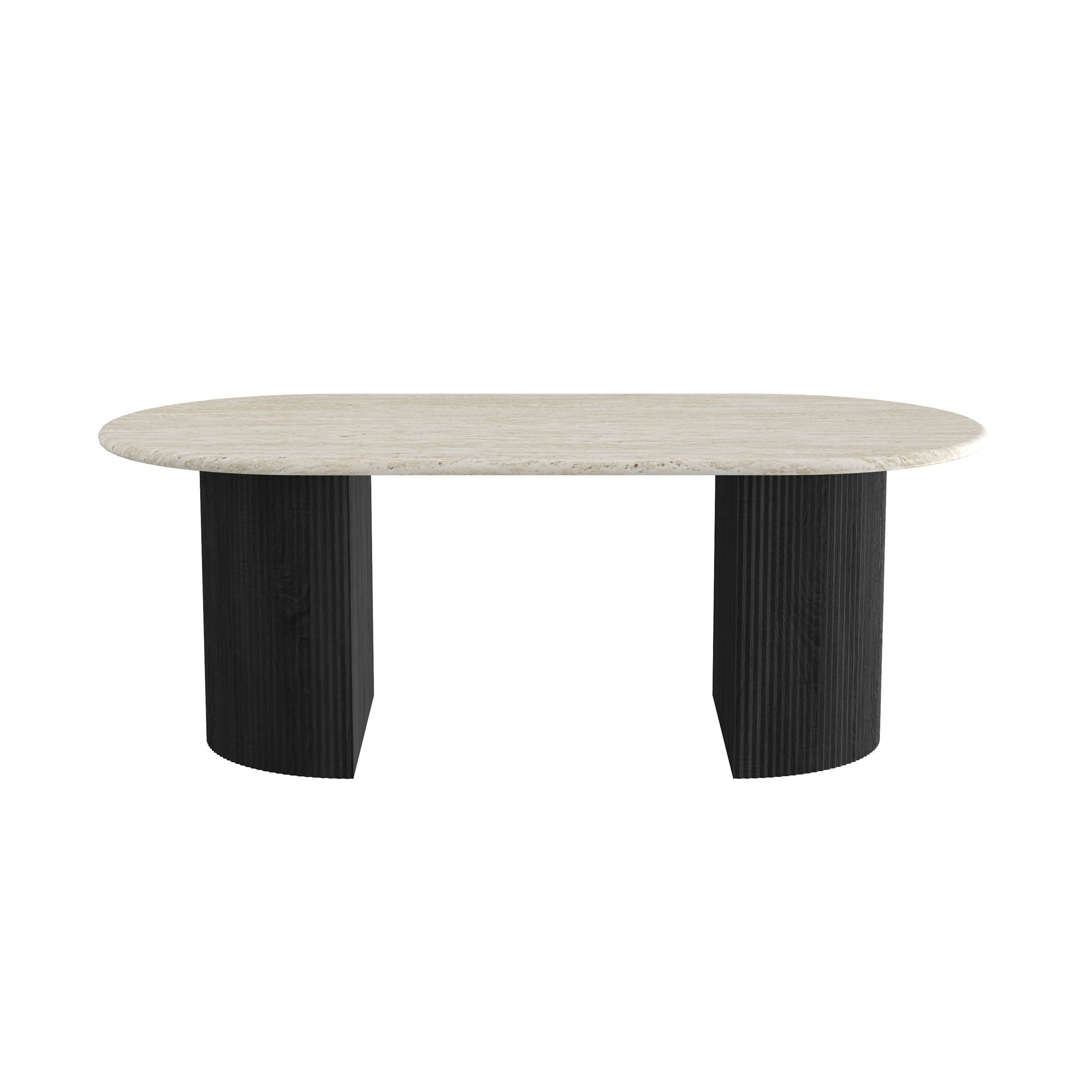 This oval table features a light marble-look top paired with black ribbed MDF-veneer bases. The soft-toned surface contrasts with the textured dark legs, merging understated elegance and modern charm—ideal for contemporary/minimalist spaces. Sturdy, budget-friendly, and polished, it balances stylish design with everyday practicality as a dining or living area centerpiece.