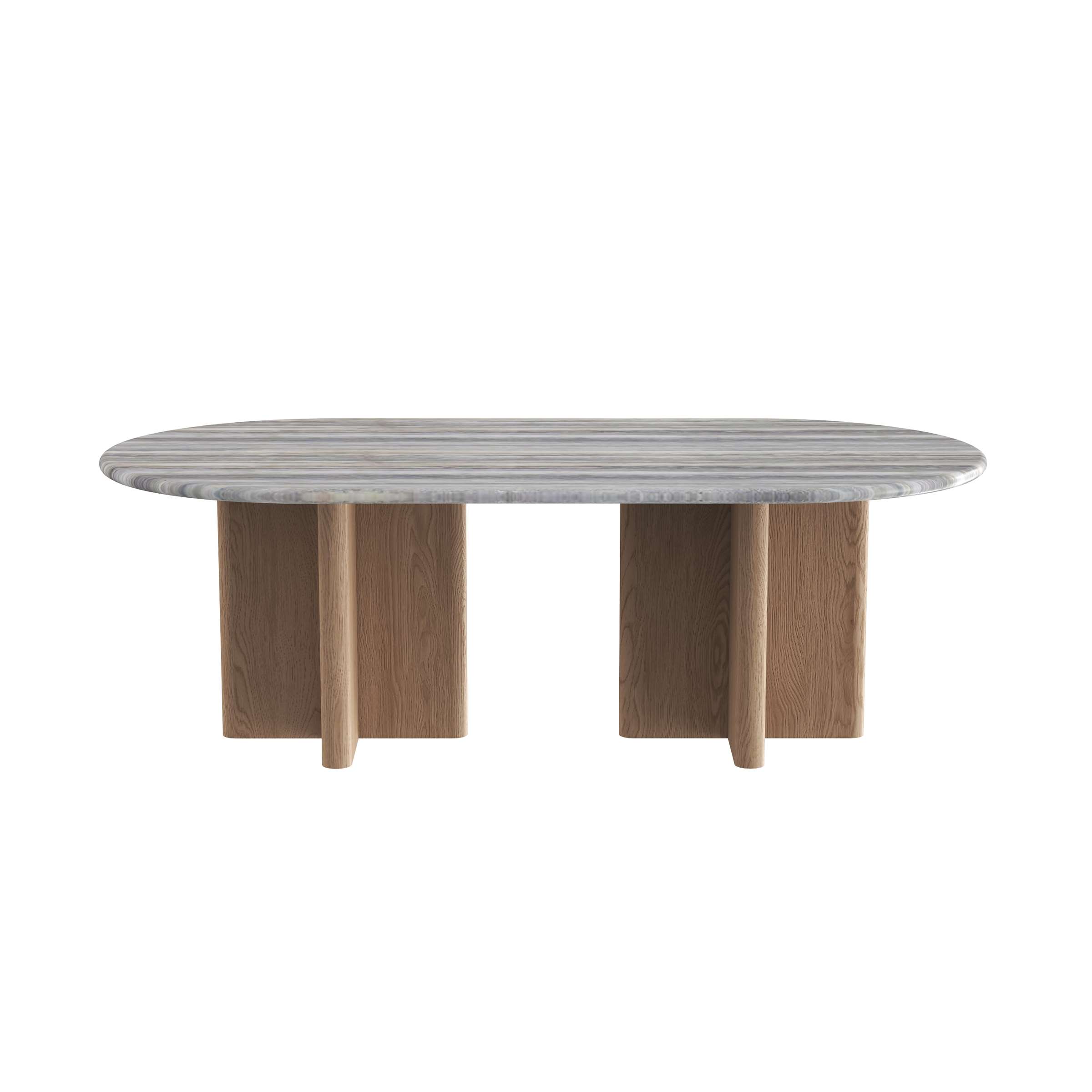 This oval table pairs an 11mm sintered stone top (striped, durable and stain-resistant) with oak-grain MDF-veneer bases. The split, blocky legs add modern texture, blending the luxe stone’s cool tones with warm wood charm—ideal for Nordic or contemporary spaces. Sturdy yet budget-friendly, it’s a polished, practical pick for dining areas, merging style and functionality seamlessly.