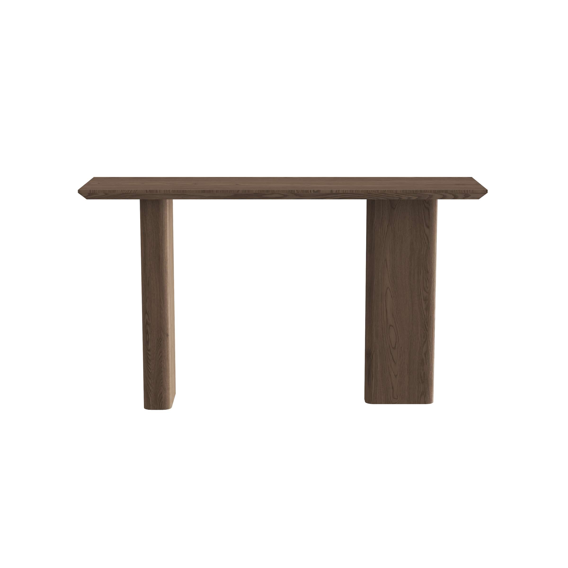This console table features warm walnut-textured MDF veneer, with a sleek, angular top and thick, tapered block legs that lend a minimalist, sculptural look. Ideal for modern or mid-century-inspired entryways, it’s sturdy yet visually lightweight—offering a practical surface for keys or decor while adding a refined, understated woody warmth to the space.