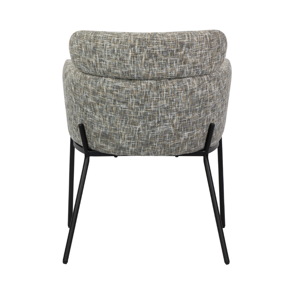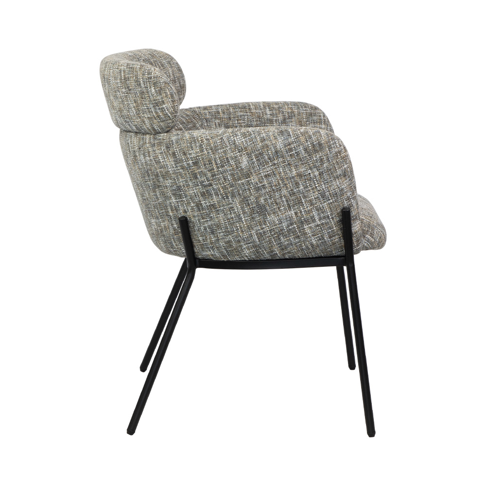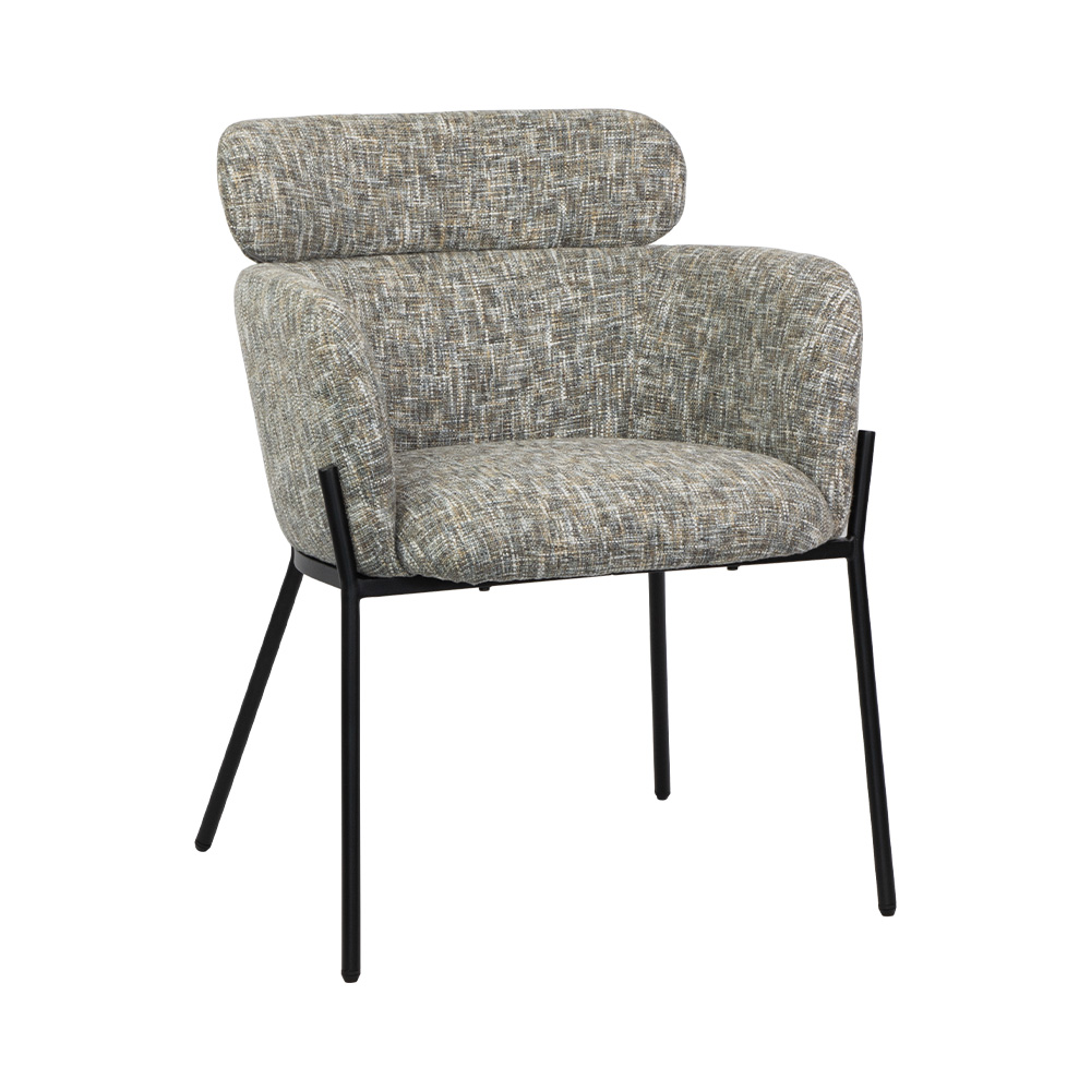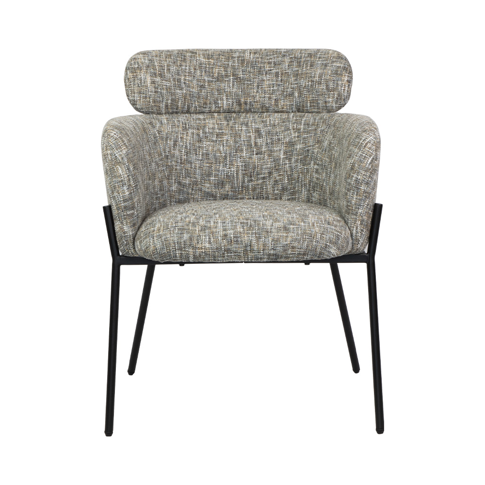 This textured accent chair is a perfect mix of cozy charm and modern edge: its multi-tonal woven fabric feels warm and inviting, while the plush “pillow” headrest and sleek black metal frame add playful, polished style. Ideal for reading nooks, living rooms, or home offices—stylish enough to stand out, comfortable enough to make every moment feel like a retreat.