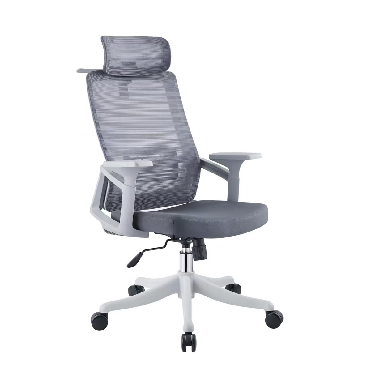 Mesh+PP headrest&backrest, fabric seat, PP armrest, class 2 gas lift, PP five star base & wheels.
