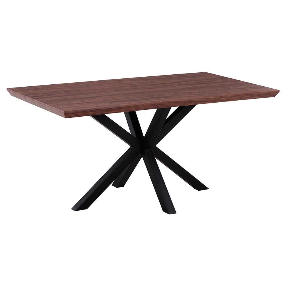 Rich walnut-textured MDF with paper top with a bold, spray-painted iron X-base. Its modern, sculptural frame blends warm wood tones with industrial edge—sturdy, stylish, and a striking focal point for contemporary dining spaces.