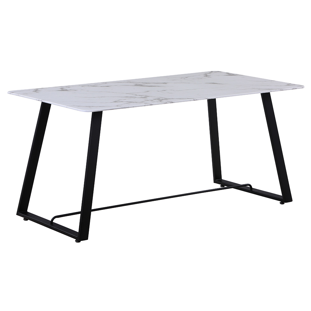Tempered glass top (marble-patterned paper finish) paired with spray-painted iron legs. Its angular, stable frame blends sleek luxe texture with industrial edge—sturdy, easy to wipe, and a modern focal point for dining spaces.
