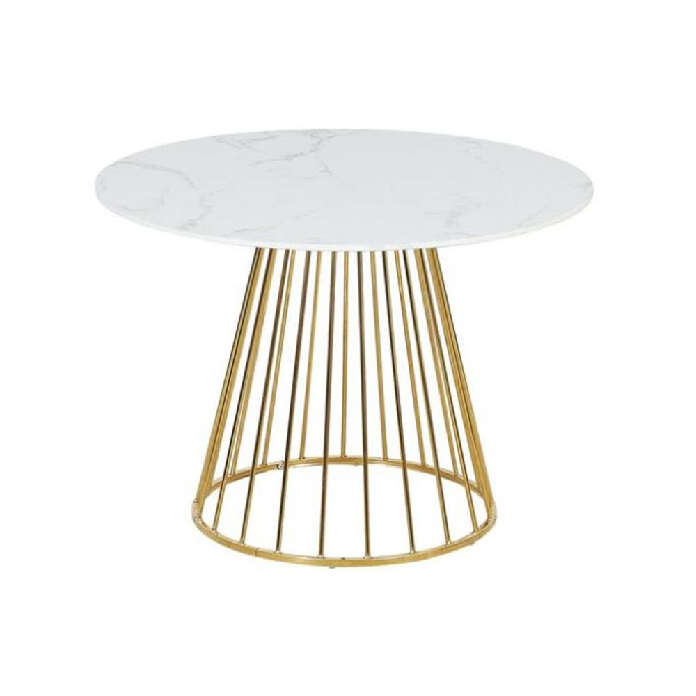 Crisp white marble-look top + sleek gold ribbed base: a blend of luxe texture and modern geometric flair. Sturdy, eye-catching, and perfect for adding a touch of glamorous minimalism to your dining space.